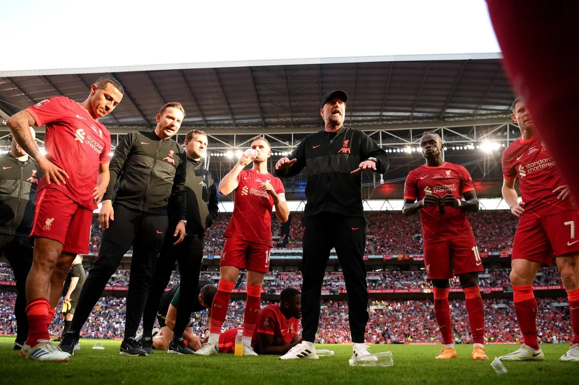 Jurgen Klopp prepares his Liverpool team before a penalty shootout in 2022. (Photo / Michael Regan/The FA/Getty Images)